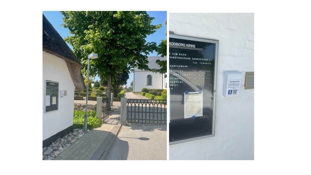 Find the stamp: The stamp is located in a box on the gable of the tomb house, by Skodborg Church.